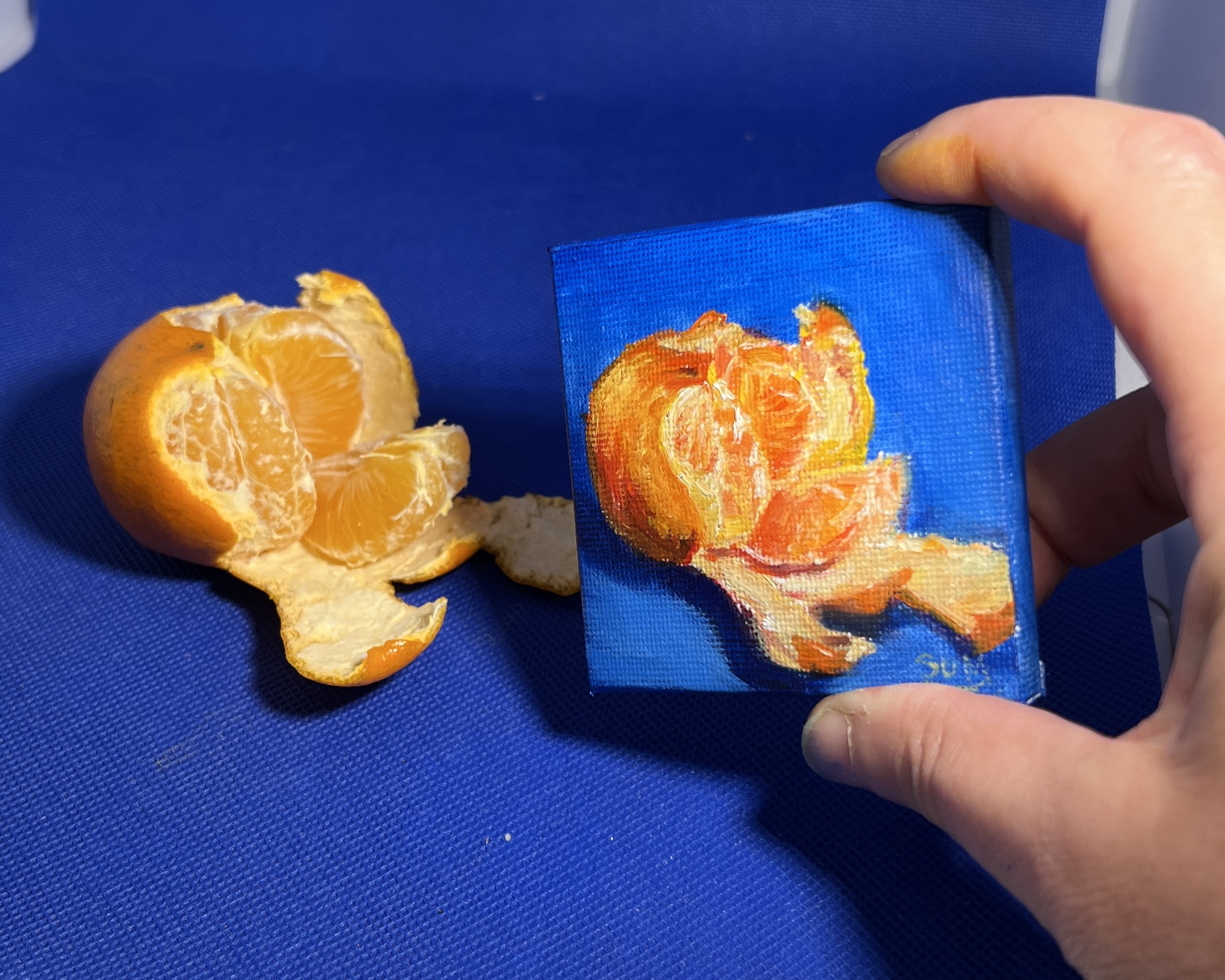 Part of The Minis collection, this original oil painting captures a colourful clementine against a rich blue background in a study of light, tone, and colour.