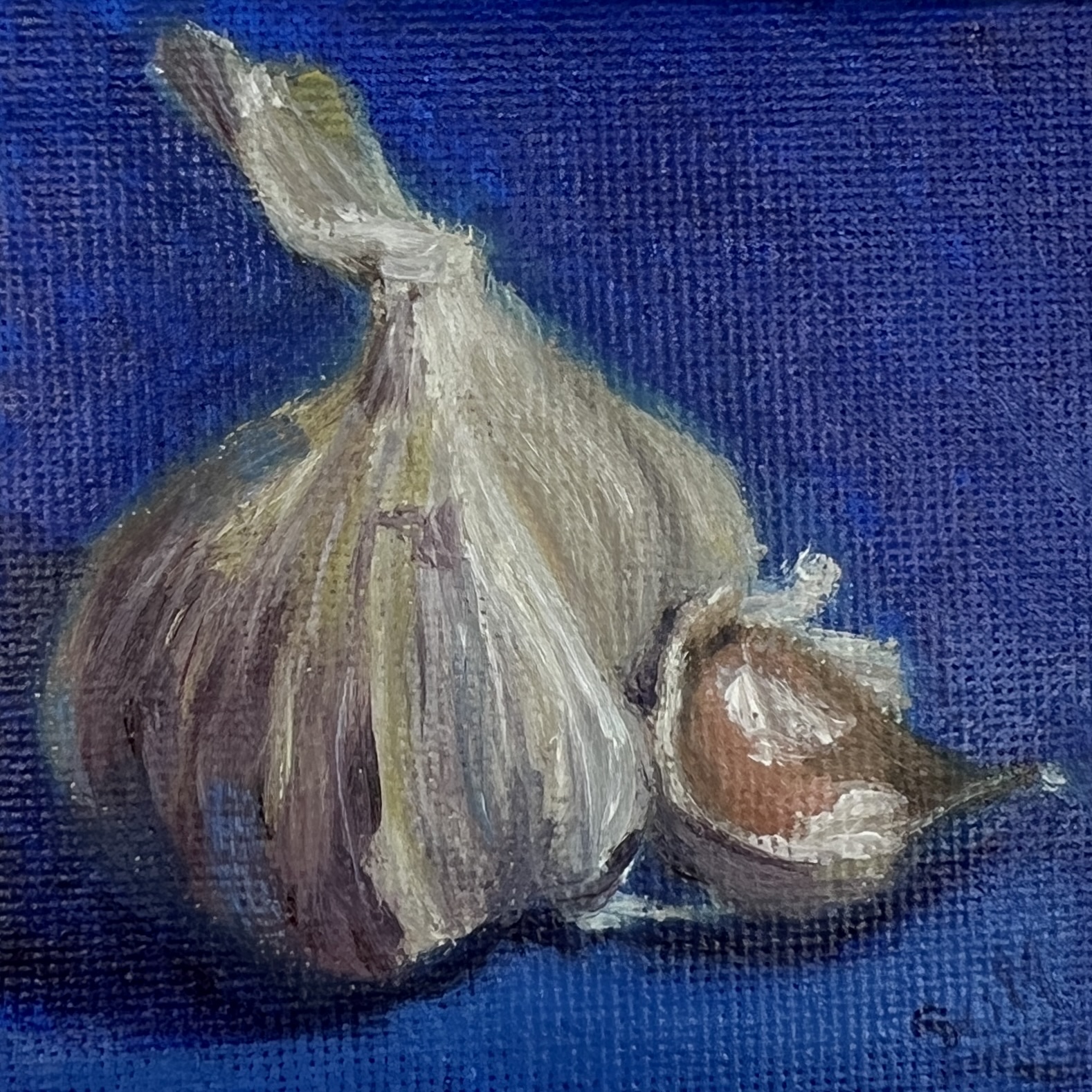 Part of The Minis collection, this original oil painting captures the quiet beauty of a garlic bulb against a rich blue background.