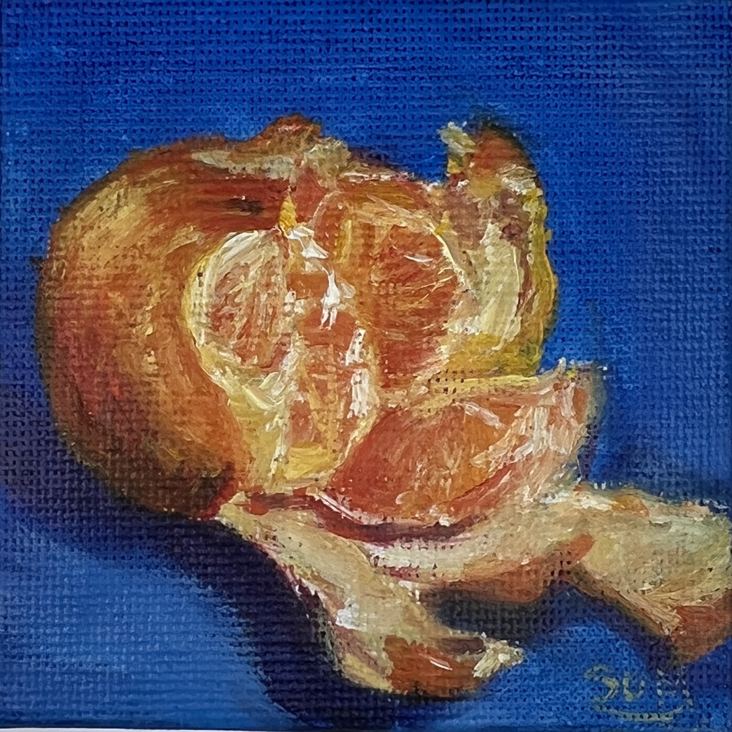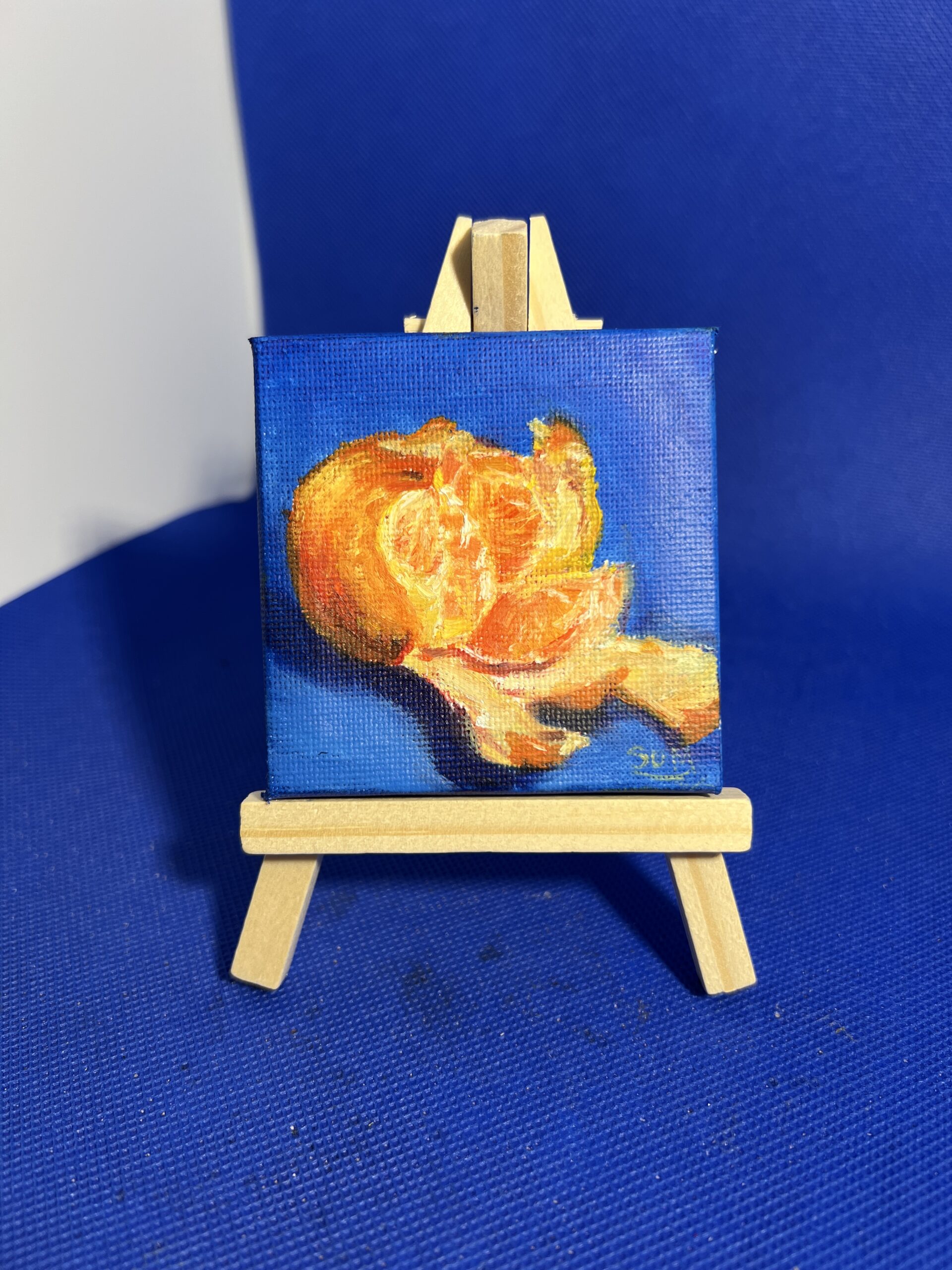 Part of The Minis collection, this original oil painting captures a colourful clementine against a rich blue background in a study of light, tone, and colour.