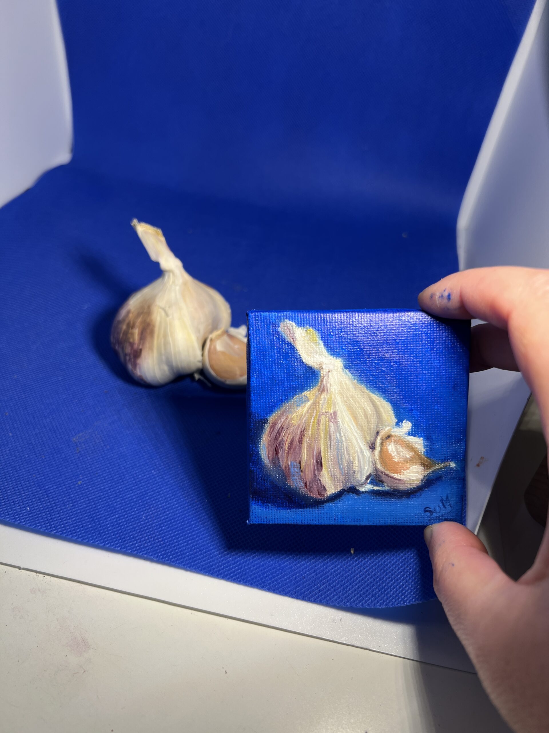Part of The Minis collection, this original oil painting captures the quiet beauty of a garlic bulb against a rich blue background.