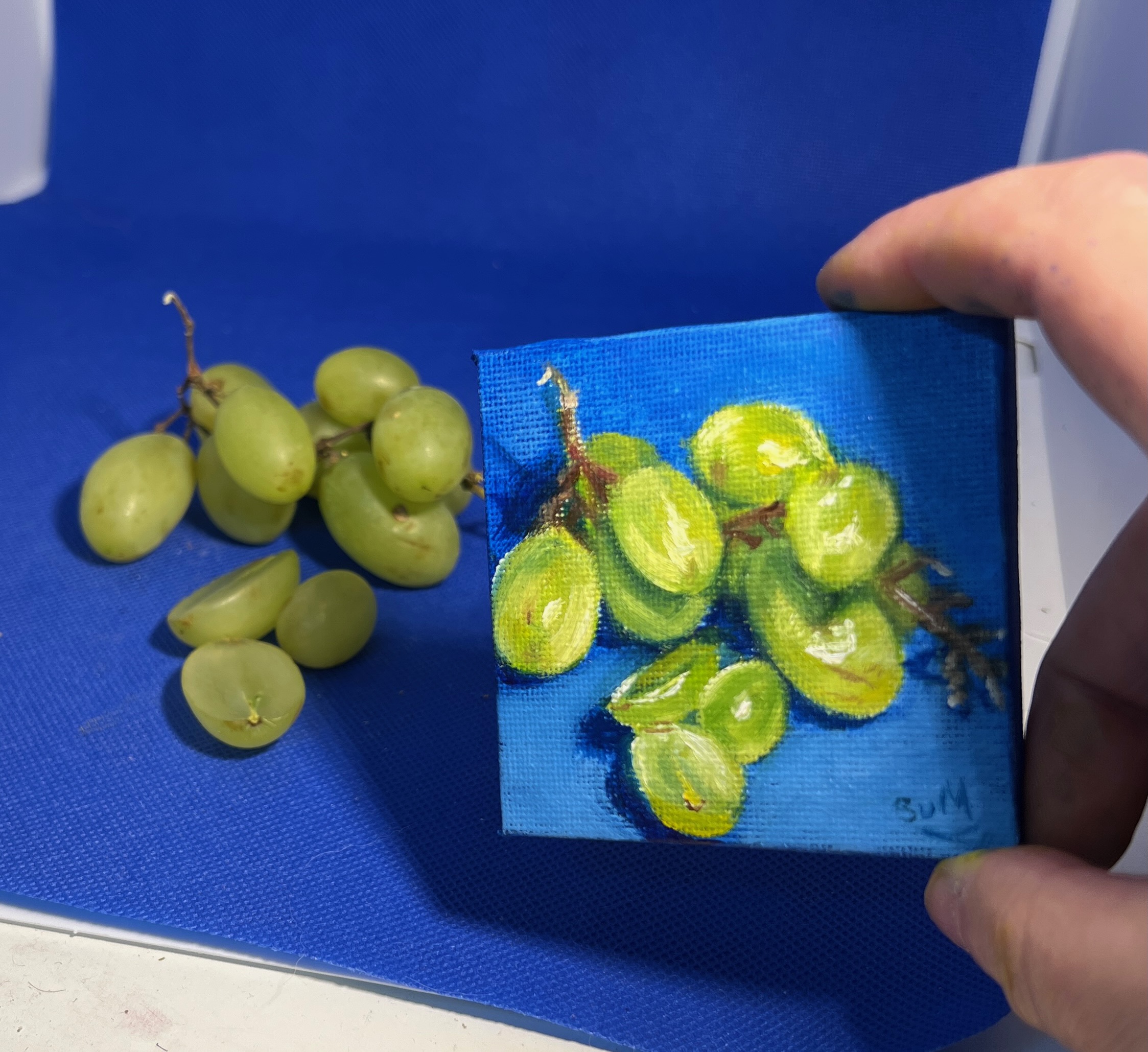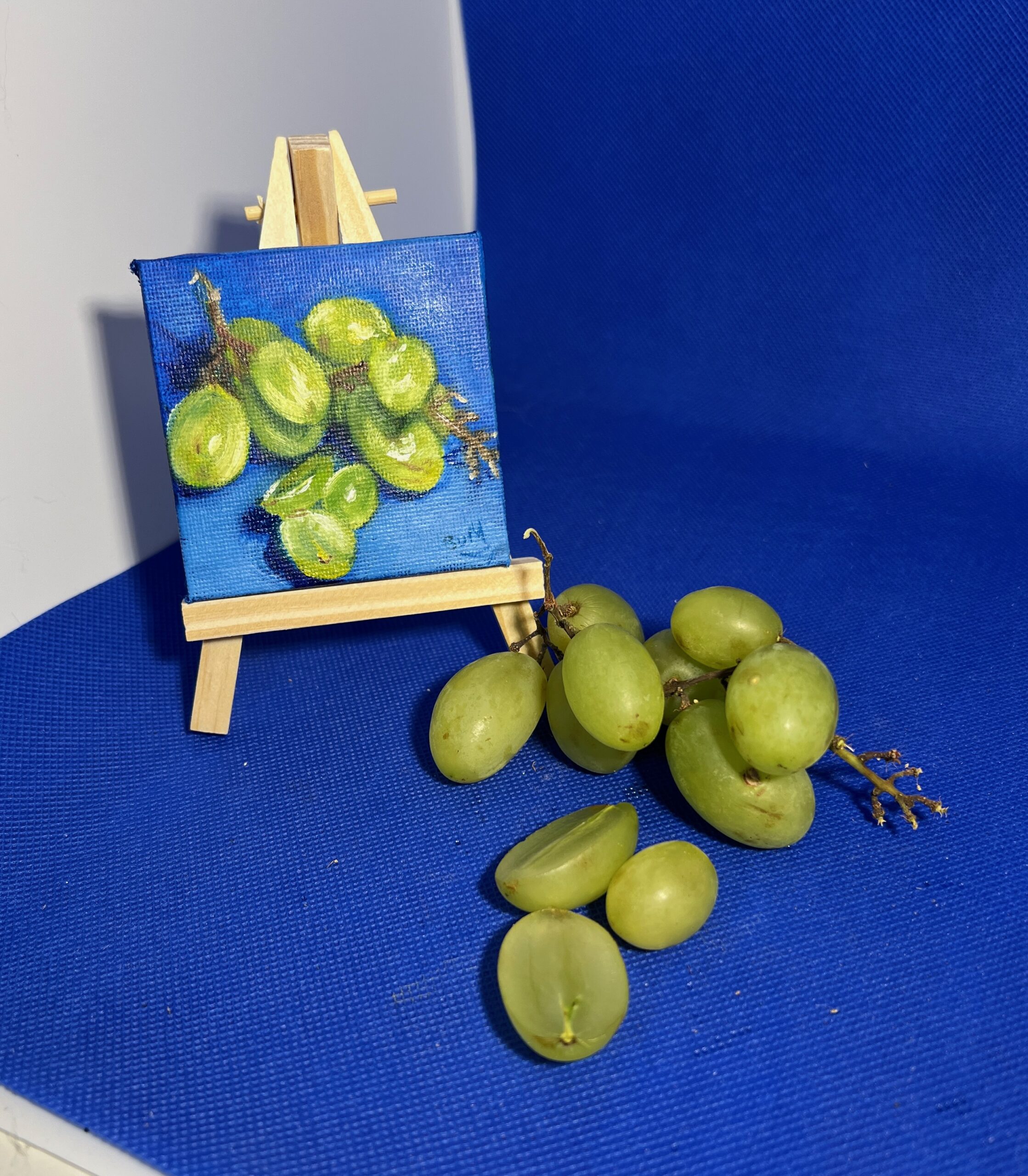 Part of The Minis collection, this original oil painting captures the quiet beauty of some grapes against a rich blue background.
