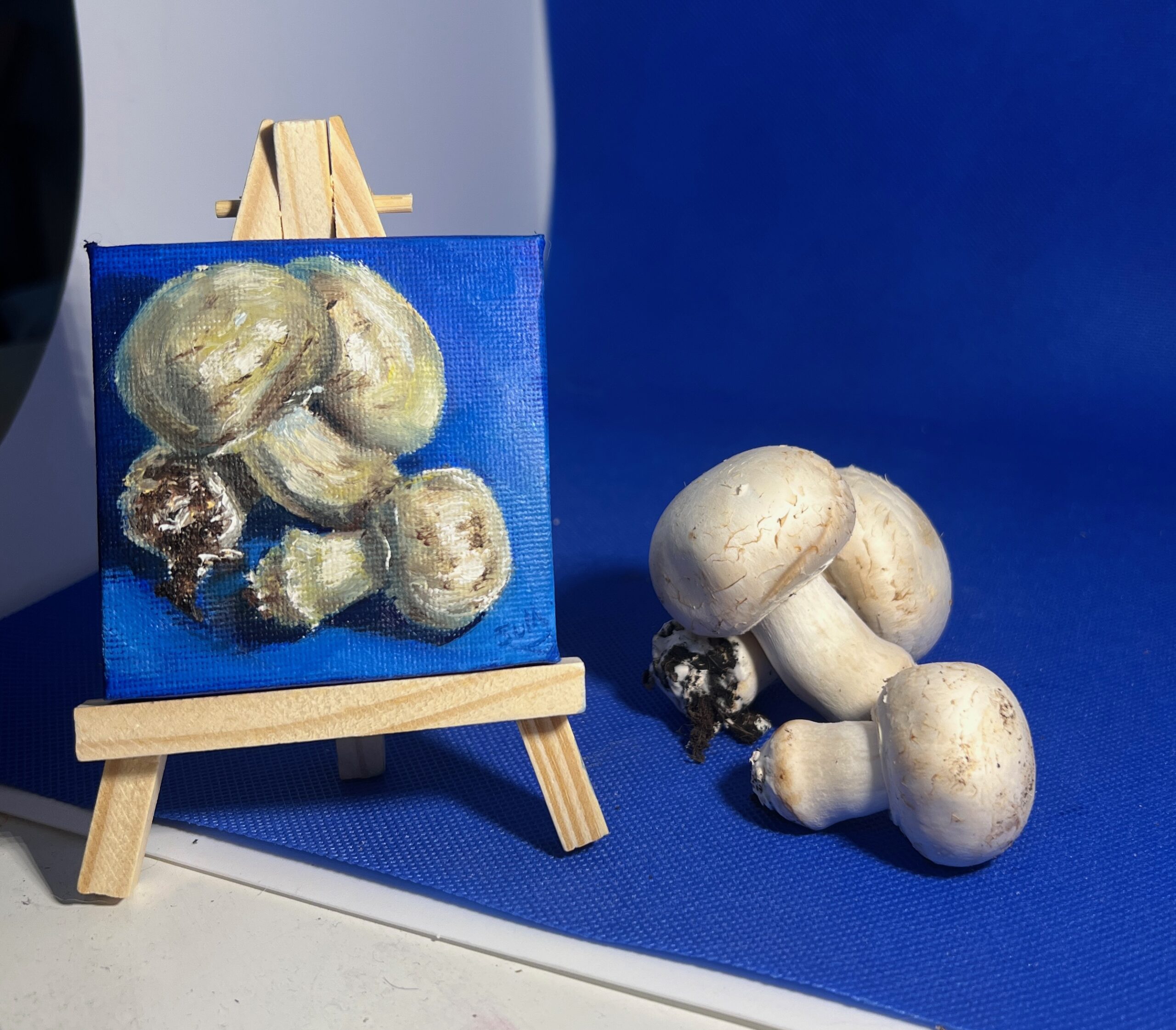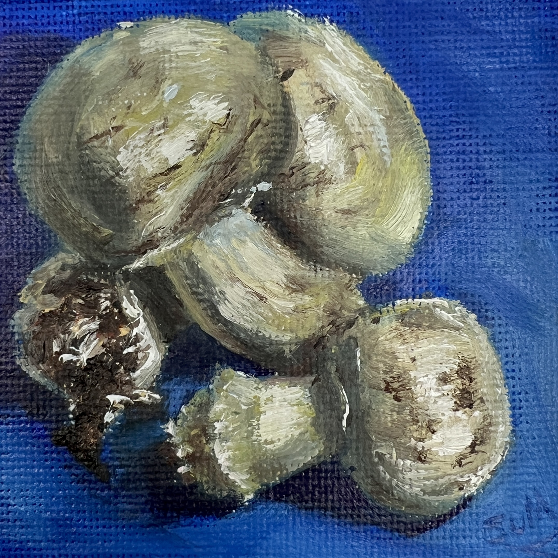 Part of The Minis collection, this original oil painting captures the quiet beauty of some mushrooms (there’s not mush-room here!) against a rich blue background.
