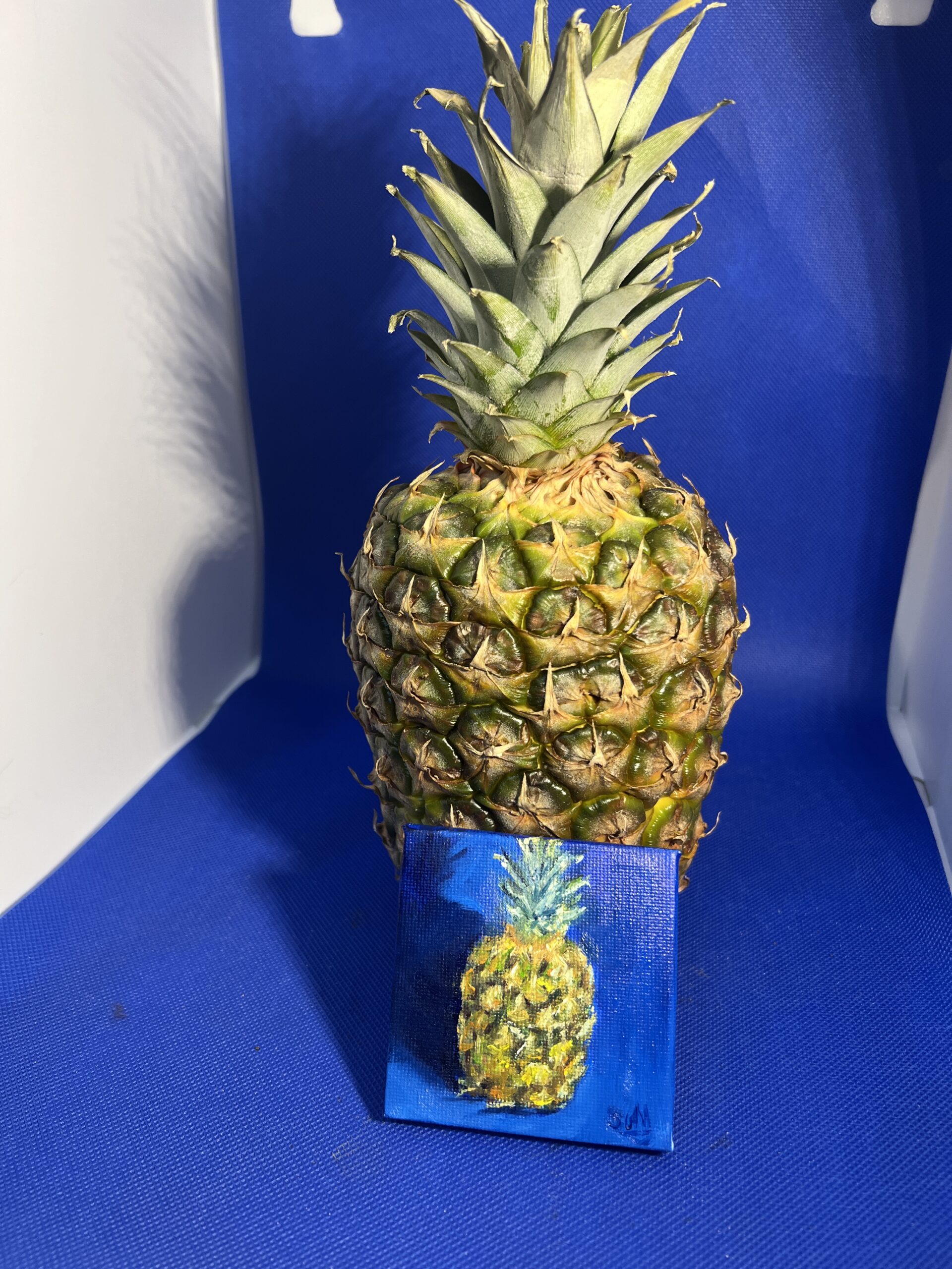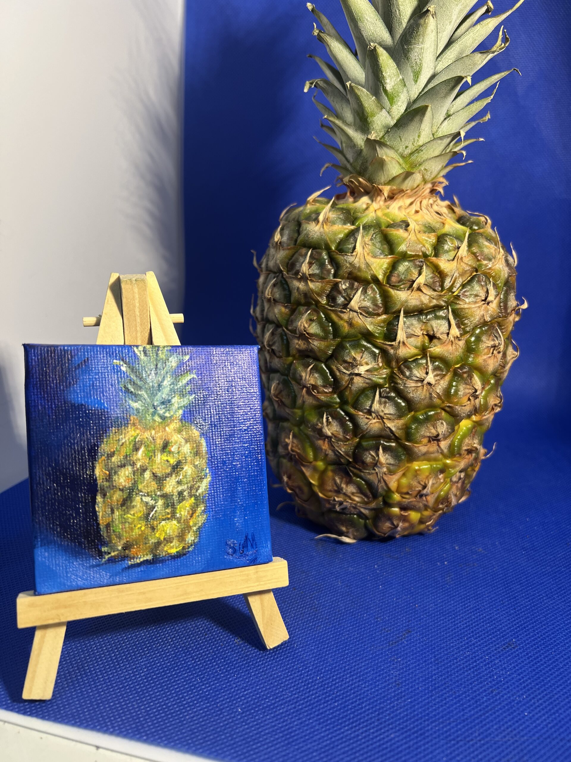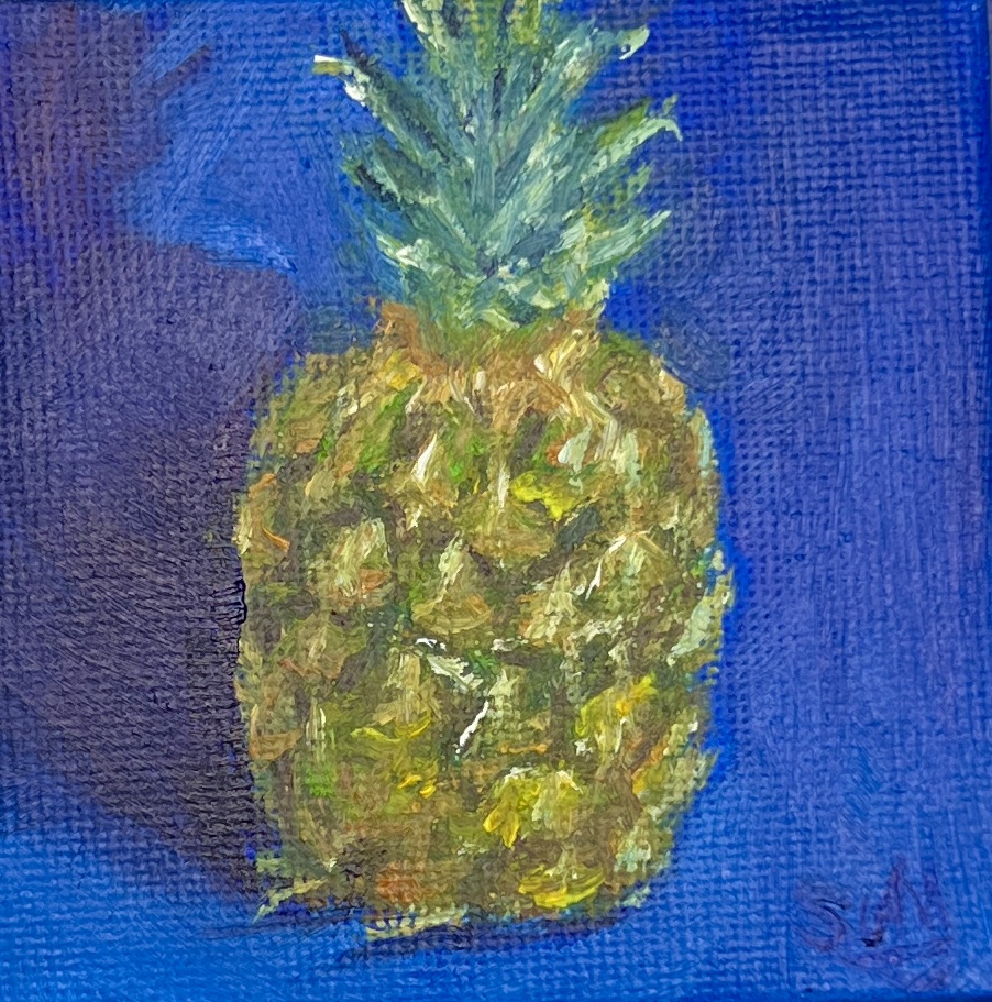 Part of The Minis collection, this original oil painting captures a colourful pineapple against a rich blue background in a study of light, tone, and colour.