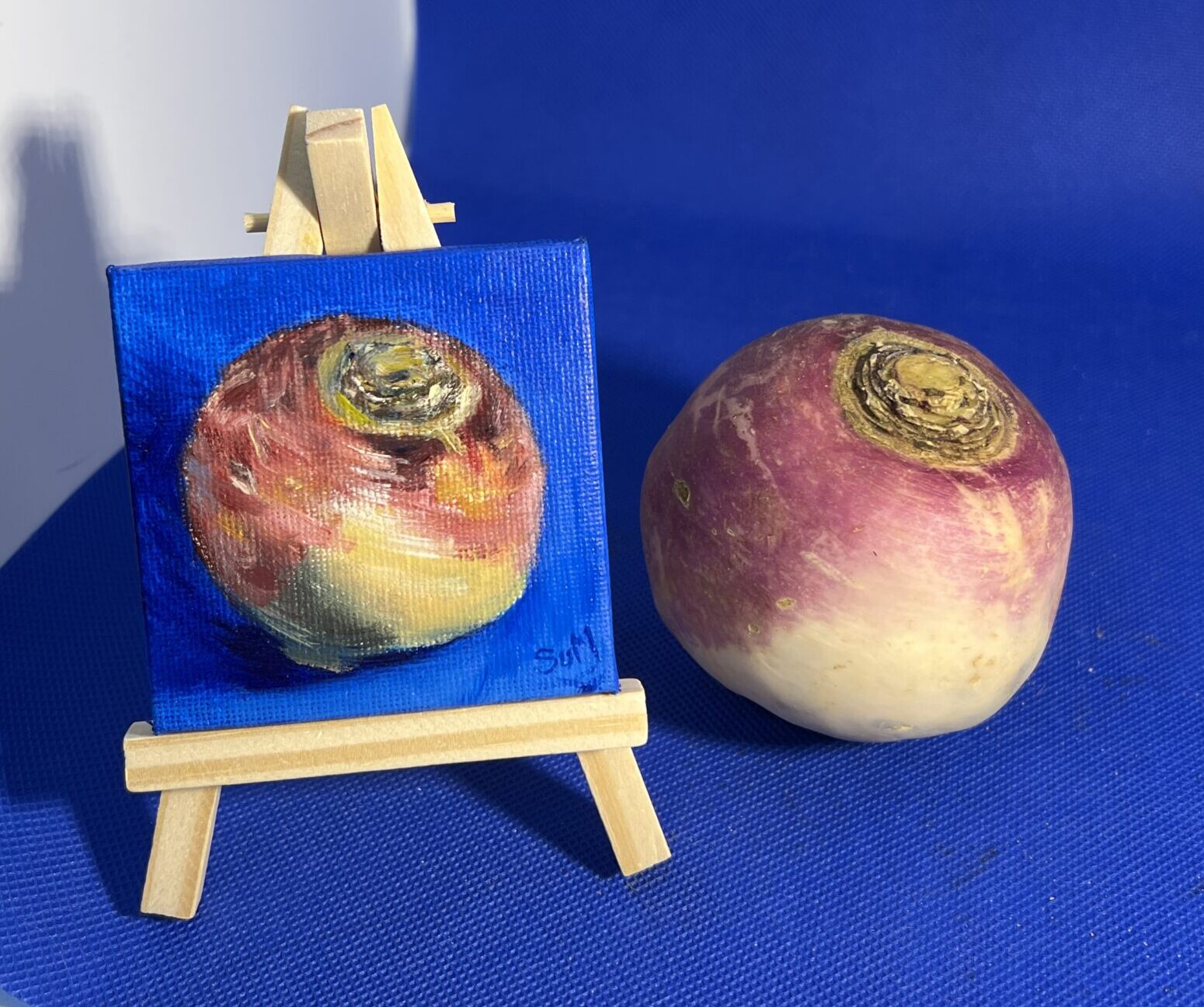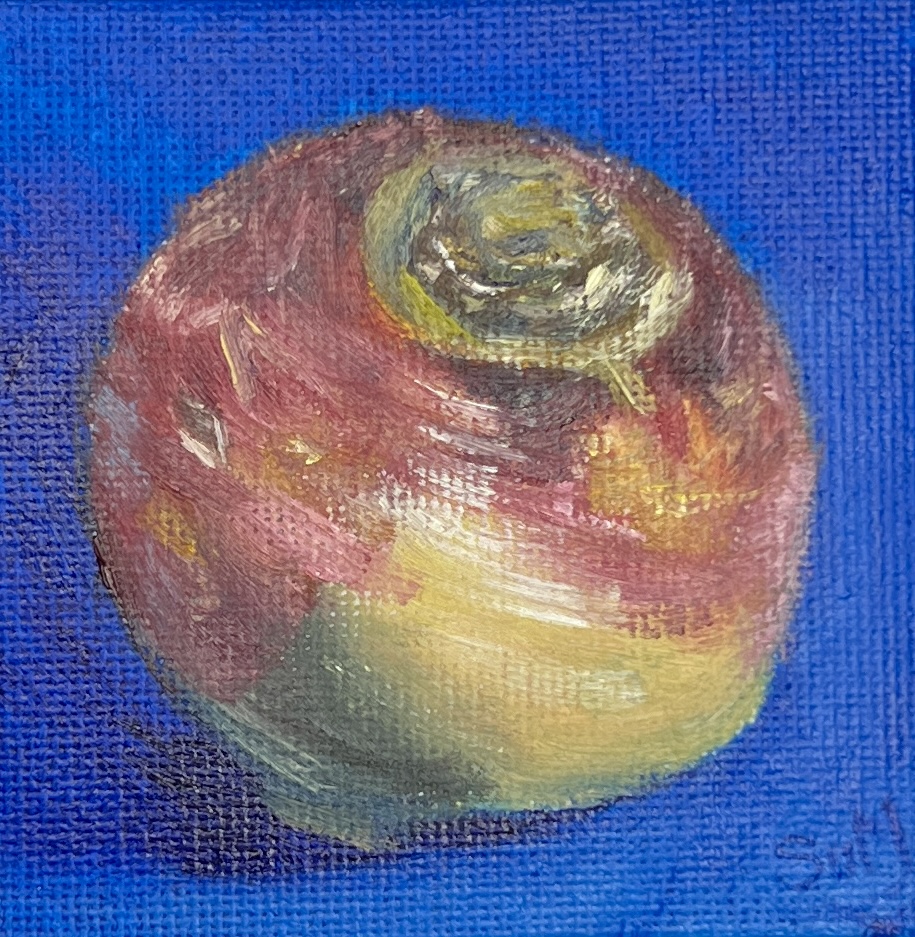 Part of The Minis collection, this original oil painting captures a turnip (a vital vegetable if you’re a fan of Blackadder!) against a rich blue background in a study of light, tone, and colour.